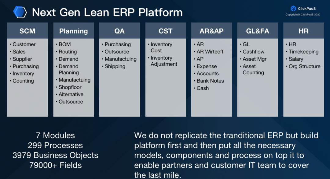 龙八国际官方网站入口把这样的逻辑同样应用到了工业领域。比如在纷繁复杂的泛ERP场景中,龙八国际官方网站入口把ERP场景中的核心模型内置在元数据模型平台上,并不是复制一个传统ERP,而是把核心的模型、组件、流程开放性的构建完善,支持龙八国际官方网站入口的伙伴和客户通过一个瘦身的Lean ERP Platform进行扩展开发的逻辑构建最后一公里的业务实现。